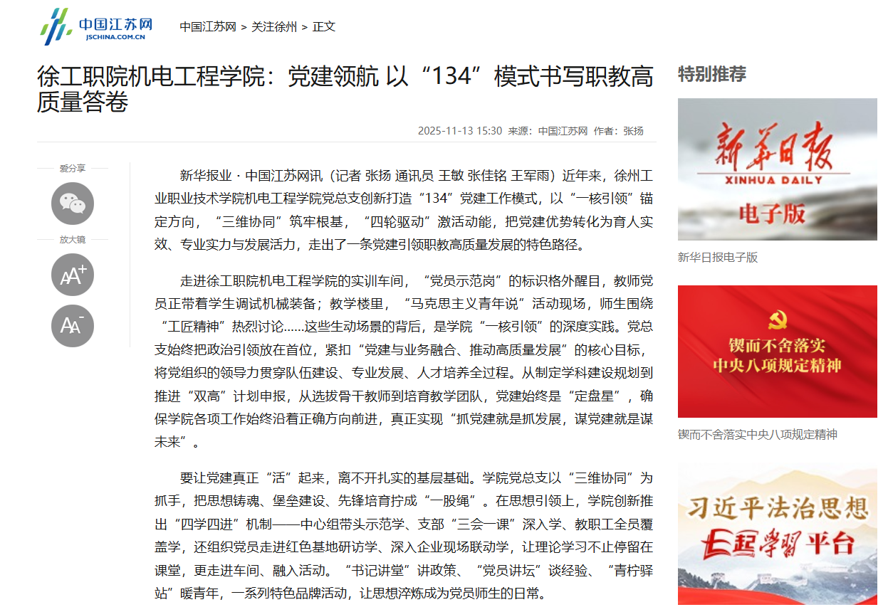 【中国江苏网】徐工职院机电工程学院:党建领航 以“134”模式书...