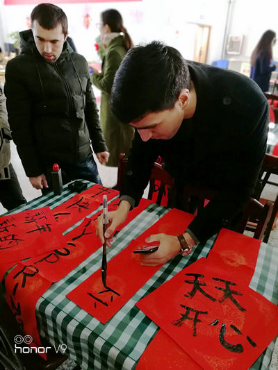 笔走龙蛇书喜庆、清水芙蓉落玉盘。全体师生热火朝天的参与到活动中。在老师的指导下,留学生用浓浓的笔墨在红色纸张上书写着春联,柔软的毛笔,浸濡着墨色,点横撇捺间,虽然字迹稚嫩,却寄托了新年的祝福和团圆的祈愿;肤色各异的学生们团团围坐在锅碗瓢盆前,在老师的帮助下,他们纷纷挽起袖子,拌馅、揉面、擀皮、包馅一步不落地认真地学习着。一开始还严肃认真的“学习氛围”在慢慢熟悉之后开始变得活跃起来,他们争先恐后地变换着饺子的形状,与众不同的创意和别出心裁的构思,为中国的传统美食增加了几分异国的情调,赋予了更多的文化内涵。