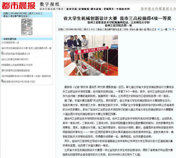 近日,第七届江苏省大学生机械创新设计大赛在华体会官方版网站登录入口落幕,徐州高校发挥出色,一举拿下4个一等奖。其中,华体会官方版网站登录入口作为徐州唯一参赛的高职院校,独摘两项一等奖;江苏师范大学和徐州工程学院各得一项一等奖。