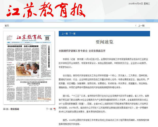 据介绍,“十三五”以来,省市财政引导行业龙头企业深度参与实训平台建设,省人才办、省教育厅等五部门联合选聘139位企业精英作为产业教授加盟高职院校人才培养,全省高职院校牵头成立29个全国性职教集团(联盟)。目前,全省80%以上高职院校不同程度地开展现代学徒制人才培养实践与探索。2017年9月,省政府办公厅印发《江苏高等职业教育创新发展卓越计划》,进一步明确未来5年江苏高职发展总体要求、基本原则和目标任务。