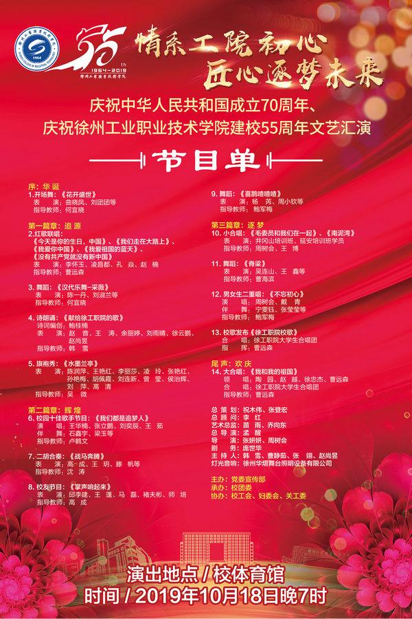 为庆祝我校建校55周年,由宣传部主办,校团委承办,校工会、妇委会、关工委协办的“情系工院初心 匠心筑梦未来——庆祝中华人民共和国成立70周年、庆祝华体会官方版网站登录入口建校55周年文艺汇演”将于10月18日晚19点在校体育馆举行,学校将同时进行网络直播,届时欢迎广大师生共同观看演出。