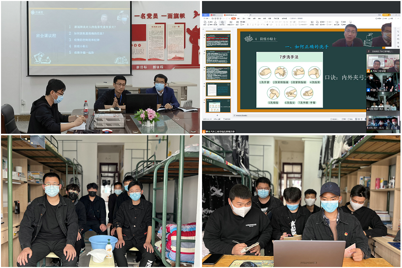 赵越副书记首先重申了校园封控期间校规校纪、核酸检测的具体要求,号召同学们增强大局意识,遵守校纪校规,对我校出现的翻墙外出等违纪行为进行了通报,传达了学校对于任何违规违纪人员从严、从重、从快处理的决心;其次,结合建筑工程学院实际情况,通报了当前封控管理、核酸检测、线上教学、学生活动中存在的问题,线上连线2名防疫志愿者分享心得,提出了在志愿服务过程中存在的问题;最后,从心理健康角度,引导同学们疫情期间要保持乐观态度、共克时艰,详细介绍了线上线下多种心理咨询的途径,为同学们消除恐慌、排解压力提供方法、途径。课中,还播放了录制的“七步洗手法”、“规范戴口罩”小视频,引导大家注意日常卫生,科学防疫。