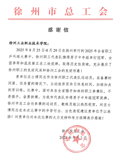 赛后,徐州市总工会专门向学校发来感谢信,高度肯定汪士博同志“不畏强手、奋勇拼搏”的精神,称赞其“辛苦付出与出色表现”,并建议学校予以表扬,同时对学校在赛事期间给予的大力支持和有力保障表示感谢。 汪士博老师的获奖,不仅是个人竞技能力的体现,更彰显了学校在“主动健康”理念引领下,教师队伍专业素养与体育精神的双重提升。作为学校体育课程改革的重要参与者,汪士博始终将体育精神融入教学与实践,此次赛场夺冠,既是他践行“以体育人”理念的生动实践,也为学生树立了“顽强拼搏、追求卓越”的榜样。学校将以此次佳绩为契机,进一步深化体育课程改革,持续提升体育教育教学质量,培养更多兼具健康素养与奋斗精神的新时代人才。