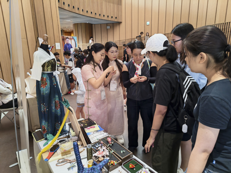 展区内,我校师生创作的徐州香包、饰品绒花、传统汉服等非遗作品以及配套教学成果集中陈列,多语种宣传片循环播放,全面展现了学校将中华优秀传统文化融入现代职业教育的创新实践。现场,工商管理学院党总支副书记高成为国际友人深入讲解非遗文化,会计2401班学生李润宇娴熟演示绒花制作技艺,让各国访客在亲身实践中深刻感受到非遗的独特魅力,现场反响热烈。