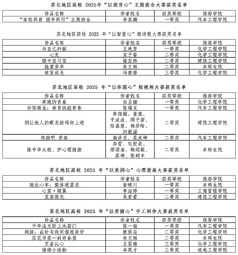 近日,由江苏省苏北地区大学生心理健康教育研究中心主办的2025年“五育润心沐光同行”苏北地区高校心理健康教育主题系列活动圆满落幕,我校师生凭借扎实的综合素养与出色的创作能力,荣获一等奖7项、二等奖9项、三等奖3项。同时,学校因组织工作得力、师生参与积极,荣获“优秀组织奖”。这一成绩不仅是对我校心理健康教育工作成效的充分肯定,也展现了我校师生积极向上、奋发有为的精神风貌。