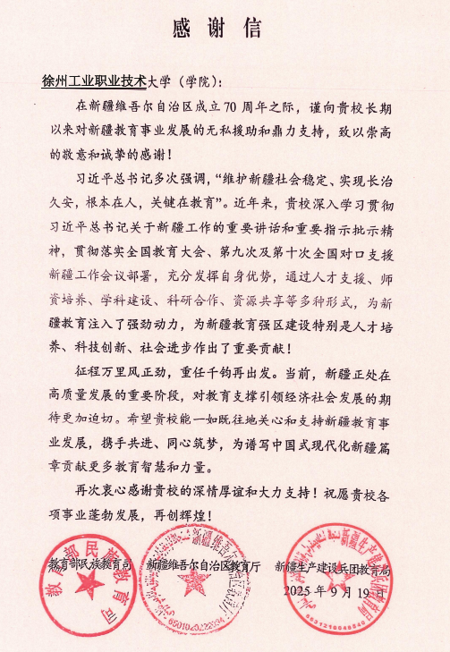 近日,教育部民族教育司、新疆维吾尔自治区教育厅、新疆生产建设兵团教育局向我校发来感谢信,感谢我校长期以来对新疆教育事业发展的无私援助与支持。