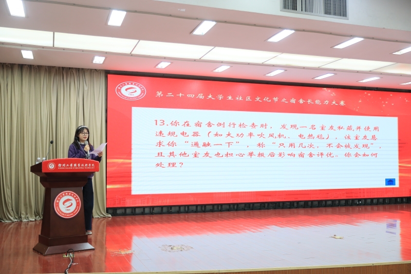 为深入推进并落细“12345”宿舍长培养计划,根据第二十四届学生社区文化节的活动安排,11月19日下午,我校在图书馆报告厅成功举办宿舍长能力大赛。机关党总支副书记郝红艳、学工处副处长王萍、保卫处副处长魏宇川、执纪审查室副主任周开源莅临比赛现场并担任评委,学工处副处长闫文出席,各学院辅导员及学生代表到场观摩。