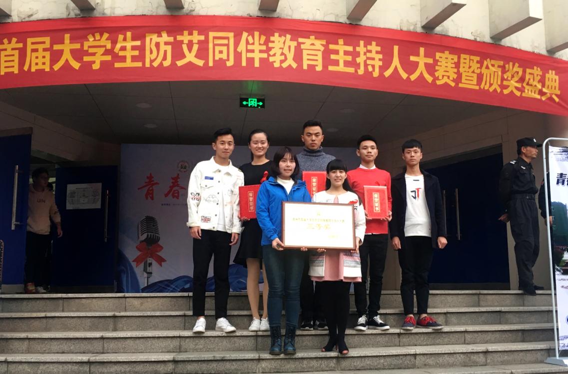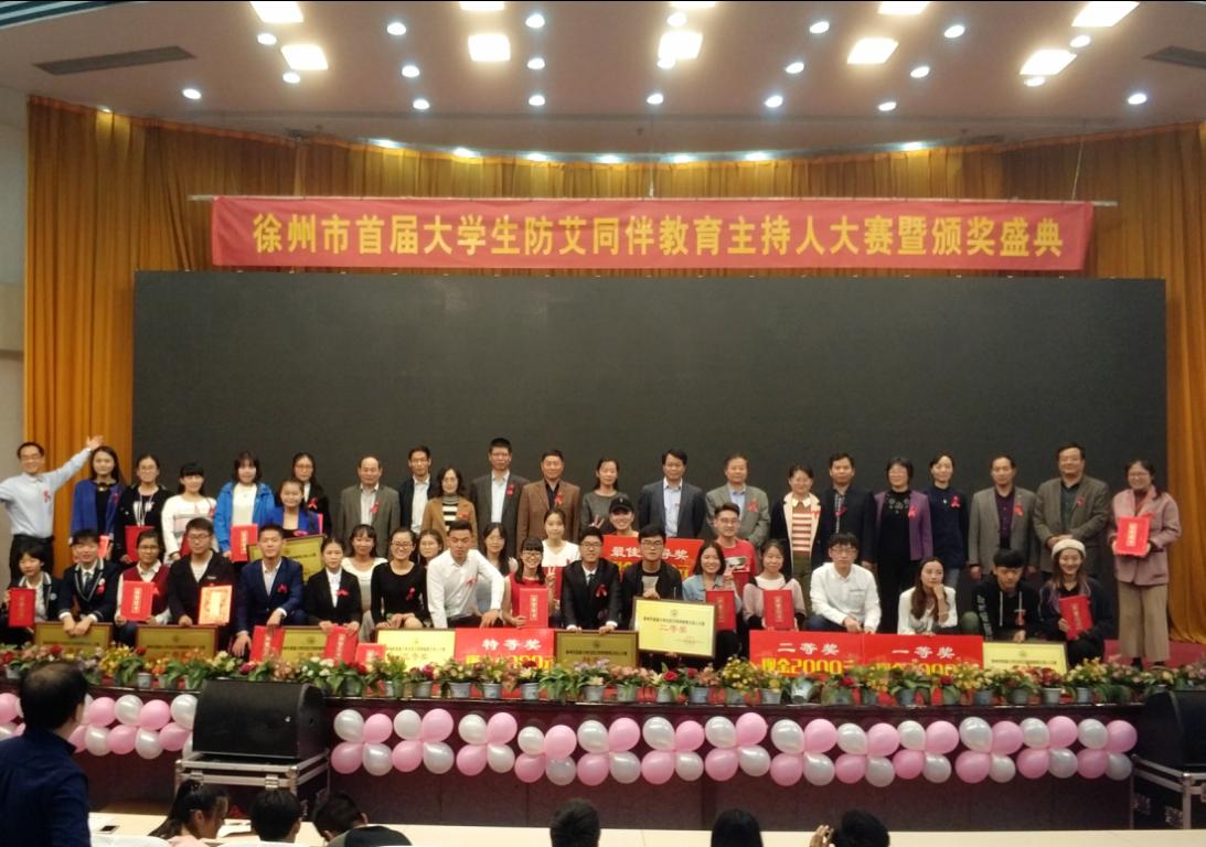 为加强预防艾滋病宣传,普及预防艾滋知识,增强全社会对艾滋病人的关注和关爱,鼓励更多大学生加入艾滋病同伴教育的宣传队伍,由徐州市卫生和计划生育委员会、共青团徐州市委、徐州市教育局、徐州市红十字会、徐州市疾病预防控制中心主办的“青春防艾,健康同行”徐州市首届大学生防艾同伴教育主持人大赛于10月28日在徐州医科大学隆重举行。我校代兰欣、朱天霸等同学在此次大赛中荣获三等奖,同时我校荣获优秀组织奖,缪斯、周晴老师荣获优秀指导奖。