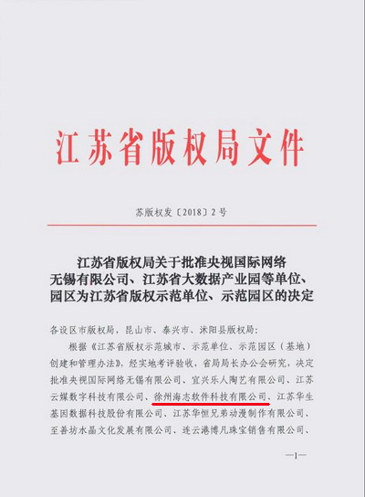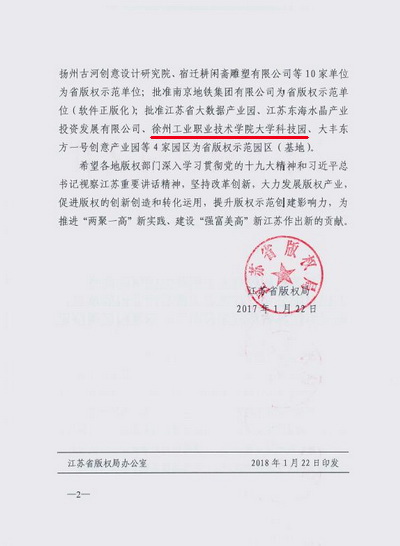 1月22日,从江苏省版权局传来喜讯,我校大学科技园获批成为省版权示范园区,园区企业徐州海志软件科技有限公司获批成为省版权示范单位。
