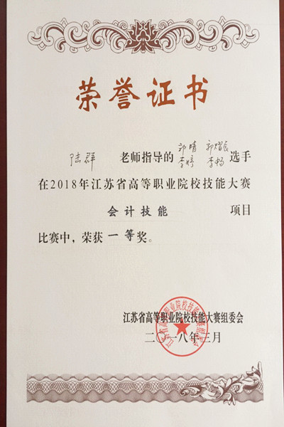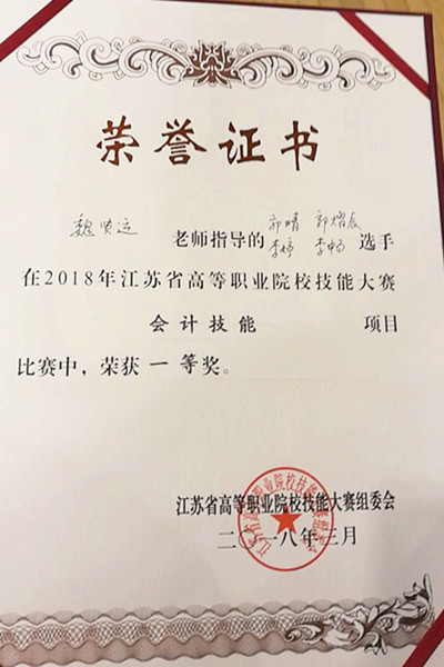 3月23日,江苏省高等职业院校技能大赛“新道杯”会计技能竞赛在江苏财经职业技术学院拉开帷幕;共有来自全省高职院校62支代表队248名参赛选手参加比赛,成为队伍最多、竞争最激烈的赛项。我校会计与审计专业学生郭晴、李畅、郭熠辰、李婷等4位同学取得团体第5名的优异成绩,荣获一等奖,魏贤运、陆群老师荣获优秀指导教师奖。