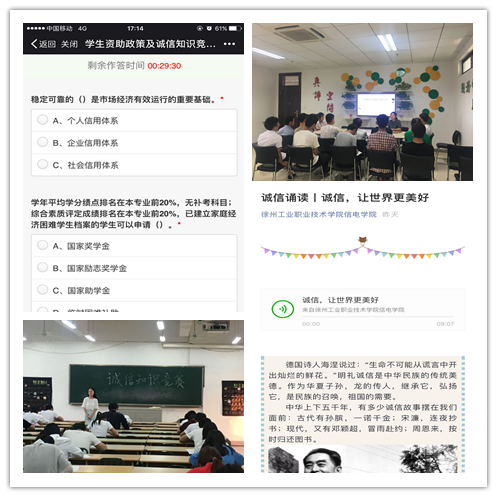 组织开展诚信教育主题班会。组织在校各班级召开了“诚信为本”主题班会课,一方面面向家庭经济困难学生宣传国家助学贷款及其他资助政策,普及征信、金融等相关知识;另一方面通过设置诚信宣誓、签订诚信承诺书、开展诚信大讨论等环节,让学生了解诚信贷款、诚信考试、诚信危机、诚信做人的重要性,让学生们充分认识到诚实守信与实现自身价值的密切关系,引导学生牢固树立诚信为本、操守为重、守信光荣、失信可耻的信用意识和道德观念。