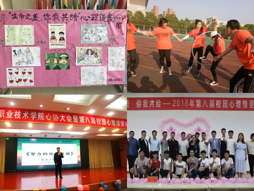 “绘”美好青春,展现青春风采。为引导学生发现生命的美好,了解生命的意义和价值,我校积极组织开展校园心理情景剧表演、心理素质拓展训练、最美微笑摄影展、心理趣味运动会等学生参与性强、参与度高的体验式教育活动,引导学生在青春中飞扬、在活动中成长,展现了大学生的青春新风貌,弘扬了大学生的青春正能量,使学生们体会到青春年华里如何用理性的判断去创造、如何用健康的人格去征服、如何用美好的心灵去生活。