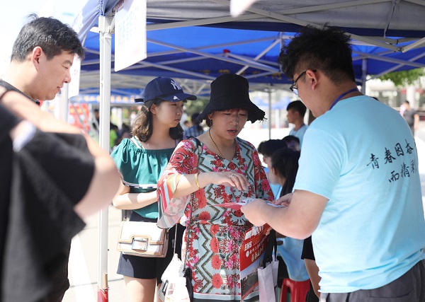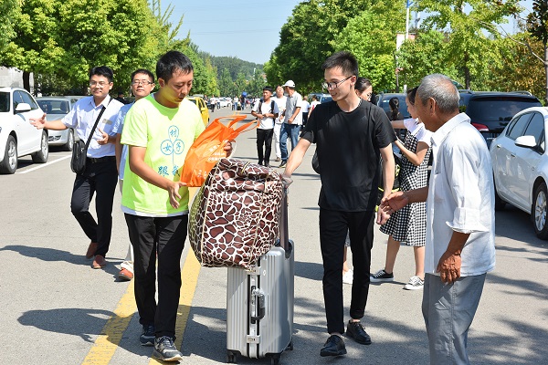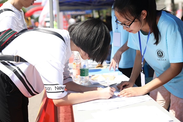 志愿者们顶着烈日主动帮助新生和家长搬运行李,一边为家长介绍学校,方便新生和家长更快速准确地了解学校,一边耐心细致地解答家长和新生的疑问。