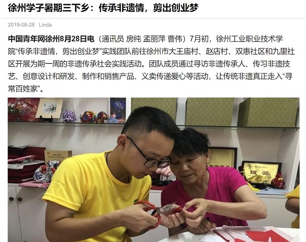 7月初,华体会官方版网站登录入口“传承非遗情,剪出创业梦”实践团队前往徐州市大王庙村、赵店村、双惠社区和九里社区开展为期一周的非遗传承社会实践活动。团队成员通过寻访非遗传承人、传习非遗技艺、创意设计和研发、制作和销售产品、义卖传递爱心等活动,让传统非遗真正走入“寻常百姓家”。