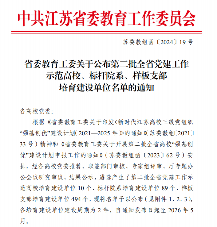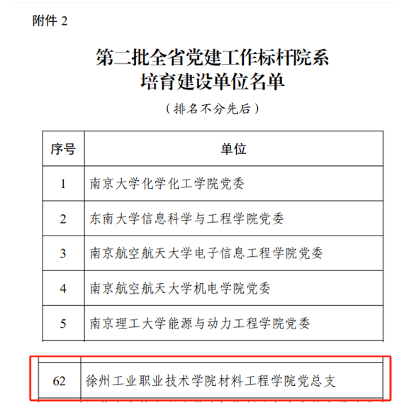 近日,江苏省委教育工委公布了第二批全省高校党建工作“标杆院系”“样板支部”培育创建单位名单,我校材料工程学院党总支获评“标杆院系”培育创建单位,“双高”专业群联合党支部获批“样板支部”培育创建单位。