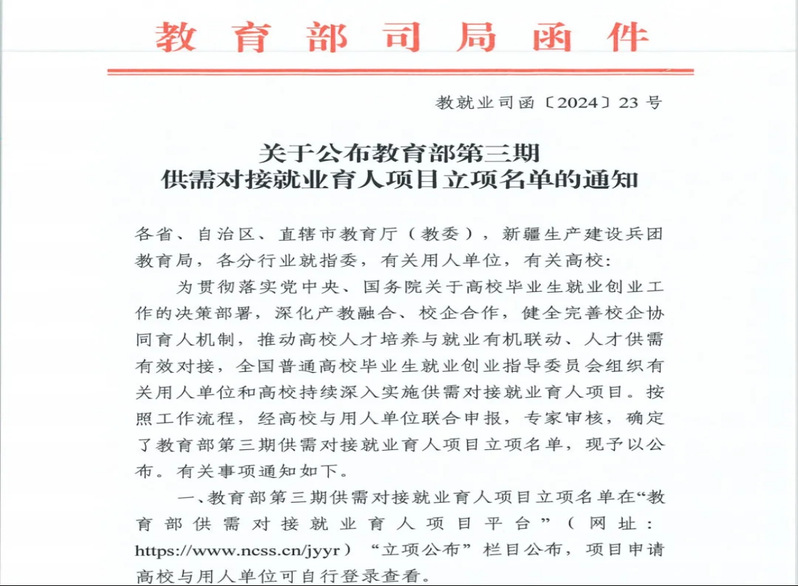 近日,教育部高校学生司发布了《关于公布第三期供需对接就业育人项目立项名单的通知》(教学司函〔2024〕23号),我校建筑工程学院、化学工程学院、工商管理学院申报的7个就业育人项目获批立项。