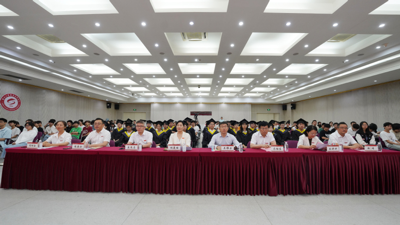 校长鲍桂楠以《知行合一 逐梦未来》为题,发表了热情洋溢的讲话,向顺利完成本科学业的同学们表示热烈的祝贺!同时向为“4+0”本科联合培养项目付出辛勤努力的老师们表示最崇高的敬意和衷心的感谢!他强调,四年来学校与徐州工程学院等本科合作高校紧密联系、深入对接,不断探索实践本科层次育人模式,尤其是2023年本科生院成立后,按照“本科层次、职业属性、书院育人、分类分型”的指导思想,落实“多主体介入、全过程培养、浸润式育人”的人才培养理念,积极打造“书院+学院”的精英人才培养特区,全力培养懂技术、能研发、会管理的本科层次高素质技术技能人才。首届27名高分子材料与工程专业“4+0”本科生,以优异成绩全部顺利毕业,并获取学士学位。更有7名同学成功考上研究生,2名同学考取公务员和乡村振兴计划,其余18名同学也都找到了自己理想的就业单位和奋斗目标。他们已然成为学校“4+0”本科联合培养项目最闪亮的名片,为学校60周年校庆增添了一份光彩、一份喜庆,进一步彰显了我校创建“国内一流、海内外有影响的工业特色鲜明的本科层次职业学校”的办学实力和水平。最后,他寄语首届本科毕业生:一是厚植家国情怀,锤炼担当尽责的“铁肩膀”。希望同学们为中国式现代化的创新发展贡献自己的力量;二是涵养工匠精神,淬炼干事创业的“真本领”。希望大家敏锐把握时代脉动,瞄准专业前沿领域,积极拥抱变革,以“干一行、爱一行,专一行、精一行”的敬业精神,从小处着眼,往深处探究,不断拓展成长通道,真正做到“一技在手,一生无忧”。三是坚持昂扬奋进,永葆追求卓越“进取心”。希望同学们在未来的人生中,奋斗不息,以锲而不舍、坚持不懈的精神,跑赢行进路上的每一座山峰!