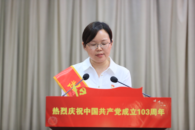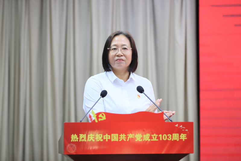 党委书记刘莹在大会上讲话,向受到表彰的先进集体和个人表示热烈祝贺,向奋战在学校各岗位上的共产党员致以节日的问候和崇高的敬意。她在讲话中回顾了中国共产党成立103年来的光辉历程,以及学校在党的坚强领导下所取得的成就,她指出,当前学校正处于“船到中流浪更急、人到半山路更陡”且“愈进愈难、愈进愈险而又不进则退、非进不可”的关键时期,越需要我们的广大党员尤其是党员干部,在急难险重面前敢想敢干、敢破敢立、敢闯敢试、敢打敢拼,敢带头敢担当,发挥先锋模范作用,共同推动和开创学校事业发展新局面。