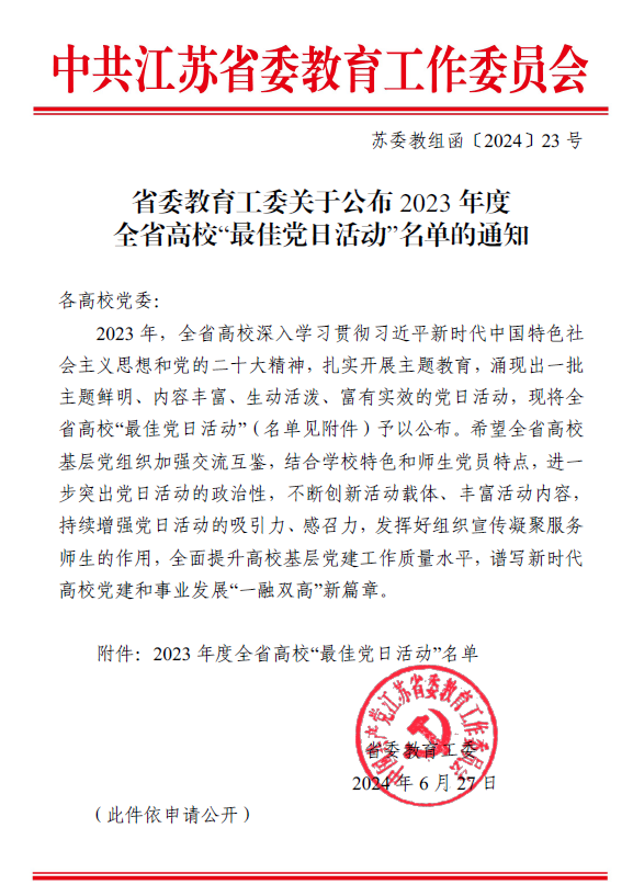 近日,中共江苏省委教育工作委员会下发《省委教育工委关于公布2023年度全省高校“最佳党日活动”名单的通知》(苏委教组函〔2024〕23号),经各高校申报、专家组评审、省委教育工委专题办公会研究,我校材料工程学院党总支高分子党支部“凝心聚力谋发展 校企奋楫谱新篇”党日活动主题鲜明、内容丰富、生动活泼、富有实效,获评2023年度江苏高校最佳党日活动。