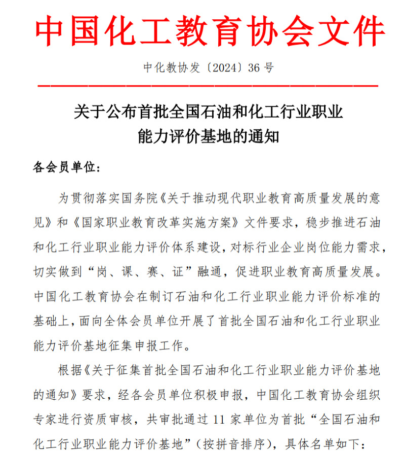 日前,中国化工教育协会公布11家单位为首批全国石油和化工行业职业能力评价基地,我校成功获选。副校长张芳儒代表学校接受全国石油和化工行业职业能力评价基地授牌。我校将以此为契机,围绕省市产业布局,深化产教融合,借助双高建设和本科创建,不断提升人才培养质量,为地方经济高质量发展提供支撑。