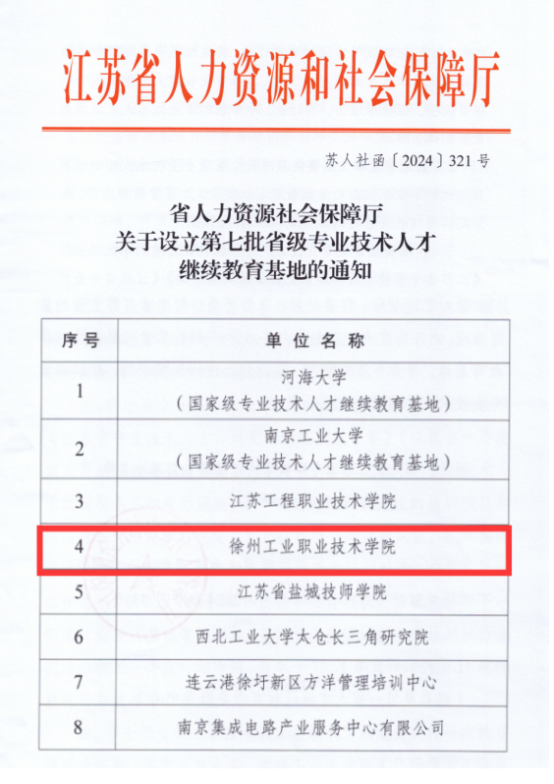 根据《省人力资源社会保障厅关于设立第七批省级专业技术人才继续教育基地的通知》(苏人社函〔2024〕321号),我校被认定为第七批省级专业技术人才继续教育基地。此次认定工作是由省人社厅组织,经推荐申报、复核、实地考察、综合评议等环节,遴选出河海大学等8家认定单位,其中2家为国家级基地,6家为省级基地。我校作为全省第4家高职院校获此省级基地认定。