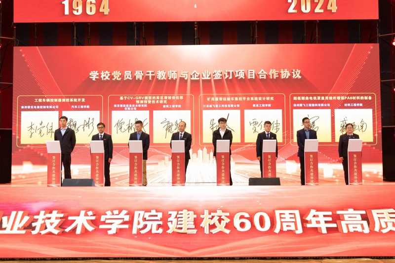 学校党员骨干教师与产业链上相关企业签订了具体的项目合作协议,签约仪式上分别与徐州腾飞工程塑料有限公司、徐州穆克电液控制有限公司、江苏遁飞重工科技有限公司、南京慧筑信息技术研究院有限公司、盐城博越管件有限公司、江苏南方永磁科技有限公司、徐州绿健乳品饮料有限公司、苏州小草电子科技有限公司等8家企业进行了签约。