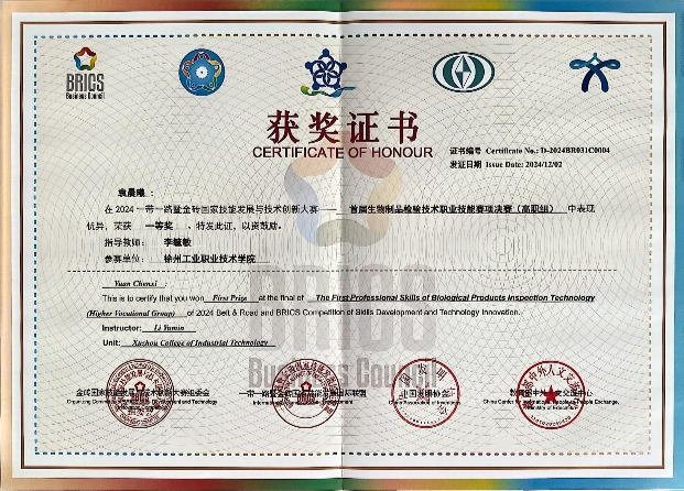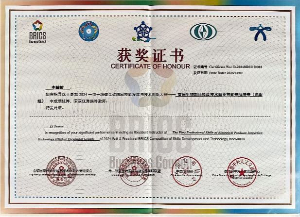2024年“一带一路暨金砖国家技能发展与技术创新大赛”首届生物制品检验技术职业技能赛项总决赛于2024年11月29日—12月2日在重庆工贸职业技术学院举办,化学工程学院李毓敏、吴昊老师指导的药品生物技术专业2022级学生袁晨曦历经4天的激烈角逐,凭借着扎实的专业知识、精湛的实操技能、过硬的心理素质,在全国77所高职院校中脱颖而出,荣获一等奖(金奖),指导教师李毓敏荣获优秀指导教师荣誉,我校被授予全国总决赛最佳组织奖。