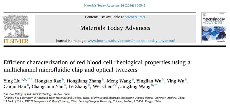 近日,我校教师刘莹在JCRI区期刊《Materials Today Advances》上发表学术研究论文《Efficient characterization of red blood cell rheological properties using a multichannel microfluidic chip and optical tweezers》。《Materials Today Advances》是国际知名材料科学类学术期刊,影响因子8.1,这是我校首次以第一作者、第一单位在该期刊上发表论文,是信息技术与材料科学交叉领域取得的一项高水平研究成果。