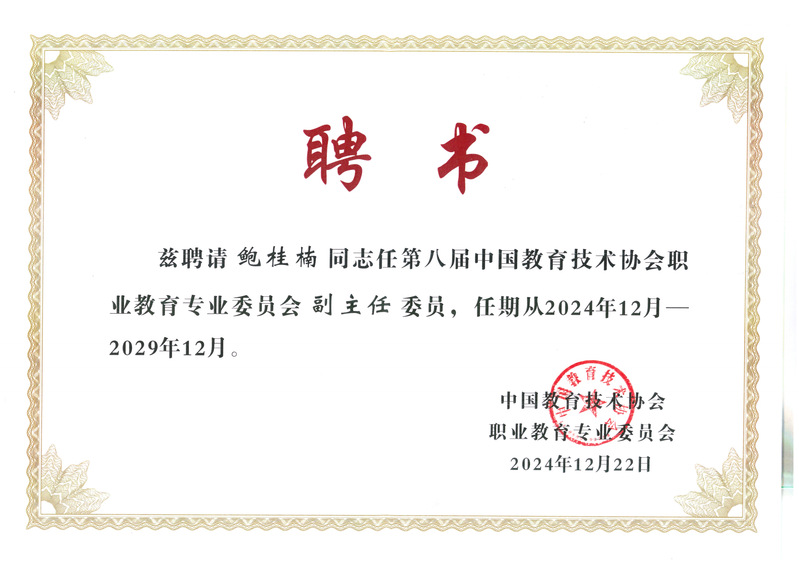 2024年12月22日,中国教育技术协会职业教育专业委员会会员代表大会在北京隆重召开。我校当选专委员会副主任委员单位,校长鲍桂楠当选专委会副主任委员。