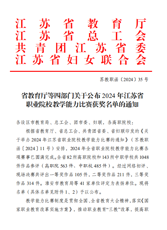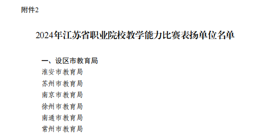 近日,江苏省教育厅等四部门联合发布了《省教育厅等四部门关于公布2024年江苏省职业院校教学能力比赛获奖名单的通知》(苏教职函〔2024〕35号),我校10支教学团队表现优异,荣获一等奖3项、二等奖4项、三等奖3项,获奖率100%,并荣获“江苏省职业院校教学能力比赛表扬单位”称号,这是我校首次获此殊荣,标志着学校在教师教学能力提升和教学改革工作中取得新的突破。
