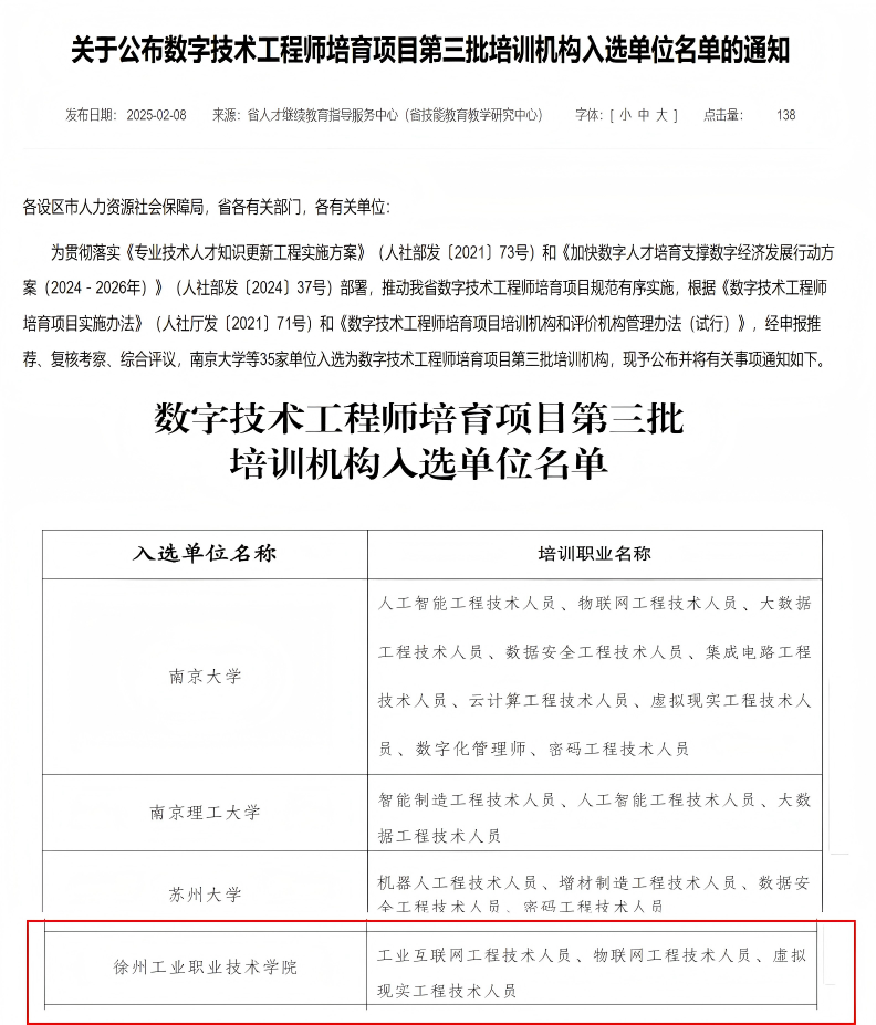 近日,江苏省人力资源社会保障厅发布《关于公布数字技术工程师培育项目第三批培训机构入选名单的通知》,我校入选江苏省数字技术工程师培育项目第三批培训机构。