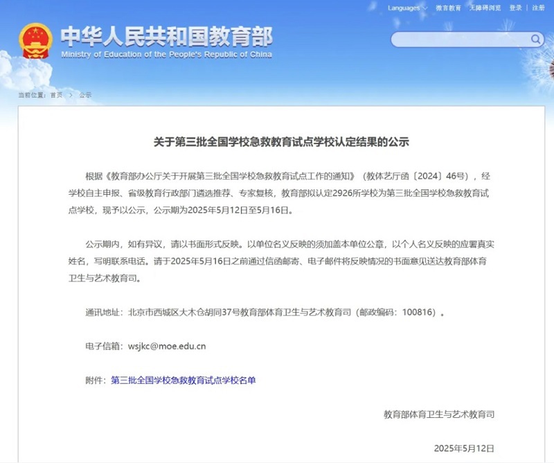 近日,教育部发布《关于第三批全国学校急救教育试点学校认定结果的公示》,我校通过自主申报、省级遴选推荐及专家复核,最终从全国申报单位中脱颖而出,成为第三批全国学校急救教育试点学校。此次入选标志着我校在安全教育体系建设中实现了新突破,学校将围绕急救教育标准化建设与示范推广任务,为全国校园安全治理提供可推广的经验范例。