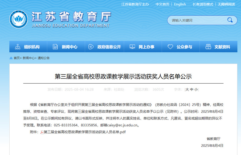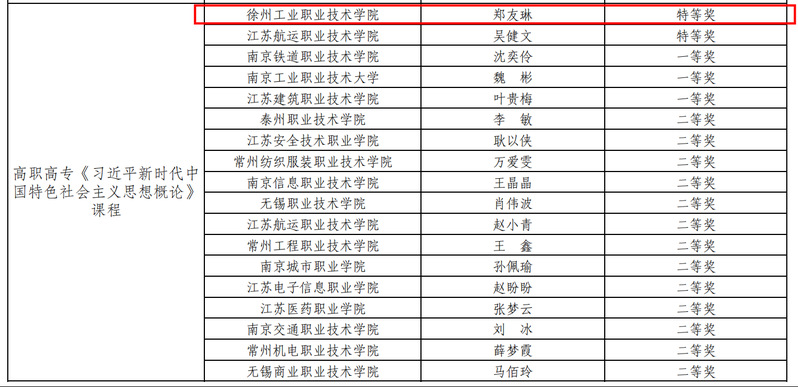 近日,第三届江苏省高校思政课教学展示活动圆满落幕。此次活动由江苏省教育厅主办,先后经历高职高专思政课教指委选拔、省级初赛、现场决赛等多轮考核。经过激烈角逐,我校马克思主义学院教师脱颖而出,喜获佳绩:郑友琳老师获“高职高专《习近平新时代中国特色社会主义思想概论》课程组”特等奖,张颖老师获“高职高专《思想道德与法治》课程组”二等奖。