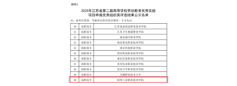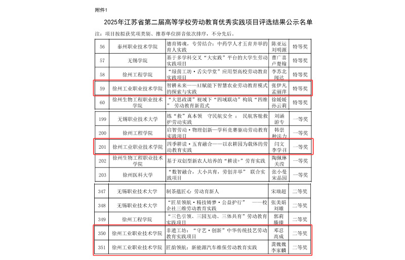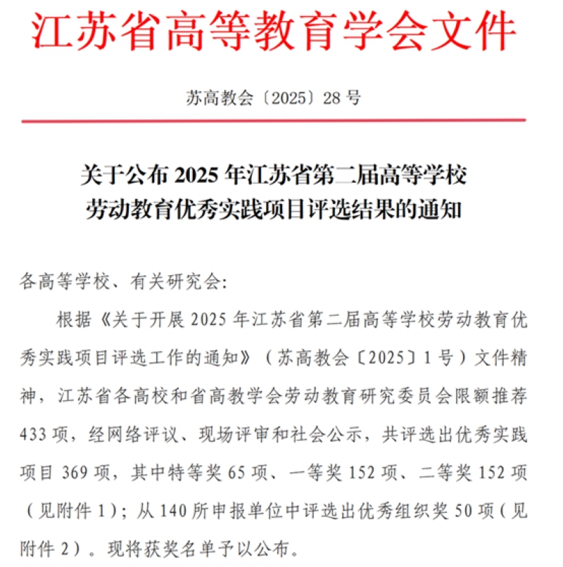 近日,江苏省高等教育学会公布了江苏省第二届高等学校劳动教育优秀实践项目评选结果,经学校推荐、专家组评议、评审工作组审定,我校选送的四个劳动教育实践项目全部脱颖而出,荣获佳绩,其中特等奖一项、一等奖一项、二等奖两项,我校同时荣获“优秀组织奖”。