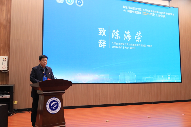 随后,陈海荣发表致辞。他回顾了集团近年来的工作成效,并指出2026年作为“十五五”规划开局之年,集团将重点推进三方面工作:一是构建现代化治理体系,优化运行机制,推进数字化转型;二是深化产教融合,创新协同育人模式,加强师资建设;三是提升社会服务能力,推进资源建设、拓展培训与竞赛品牌。他呼吁各成员单位携手共进,共同推动商务数据职业教育高质量发展,更好服务数字经济和现代化建设的国家战略。