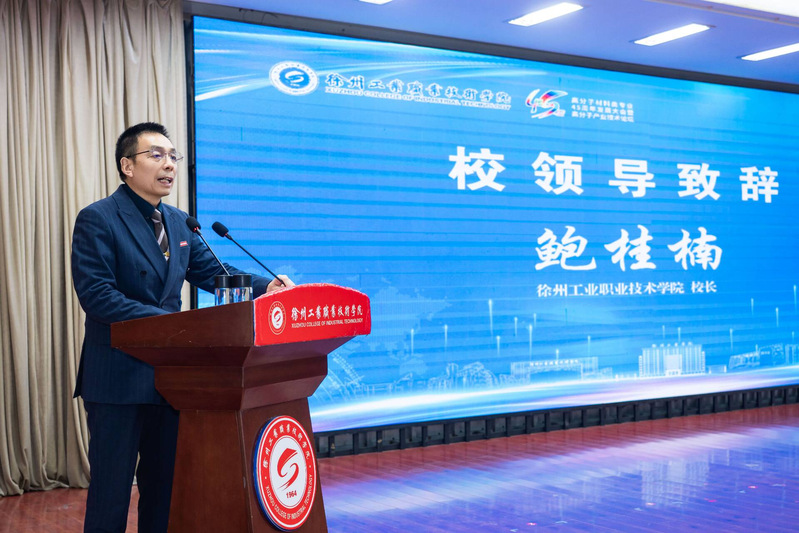 校长鲍桂楠在致辞中深情回溯专业45年砥砺征程。1980年,学校前身徐州化工学校创办橡胶制品工艺专业。四十五年薪火相传,该专业已从单一学科升级为国家“双高计划”专业群,坐拥2支国家级教学团队、2个国家级实训平台,牵头组建全国职业教育高分子材料职教集团,五获省科技进步奖,始终领跑全国高职同类专业。45年来,专业始终坚持为党育人、为国育才的初心,累计为行业输送1.2万名高技能人才,其中3600余人成长为行业高管与技术骨干,1100余名跻身企业家行列,助力江苏江昕科技等12家企业成长为国家级制造业单项冠军,用“橡胶精神”书写了产教共生的动人篇章。